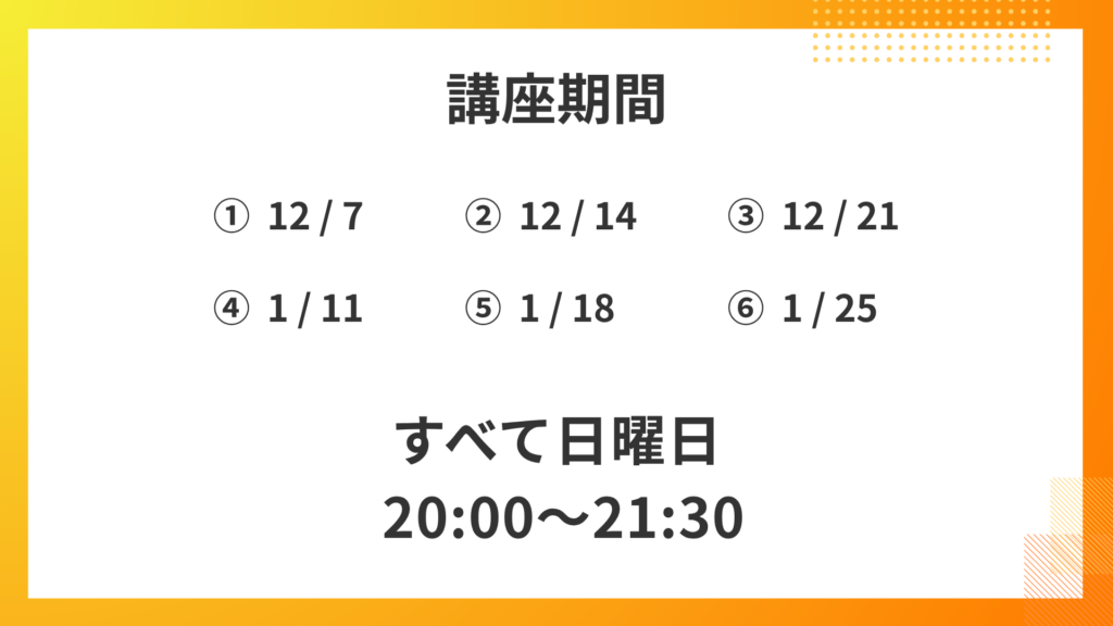 わかりやすいスライド、例え話で解説していきますのでご安心ください。日程が合いません。録画の視聴はありますか?